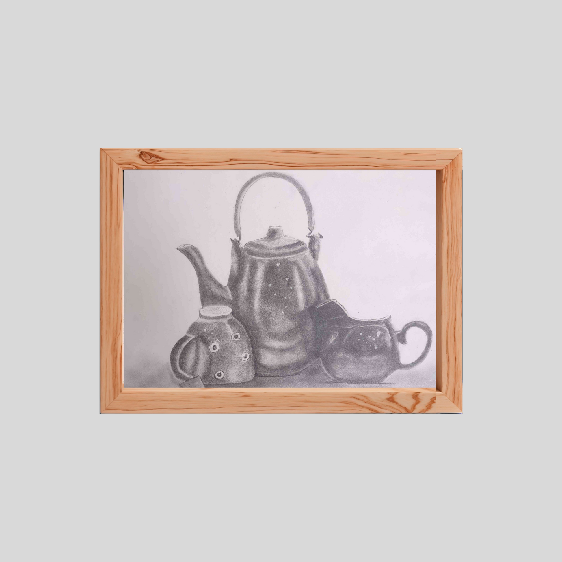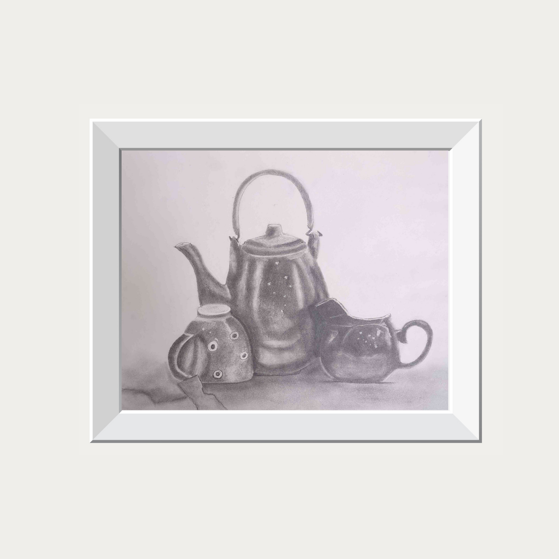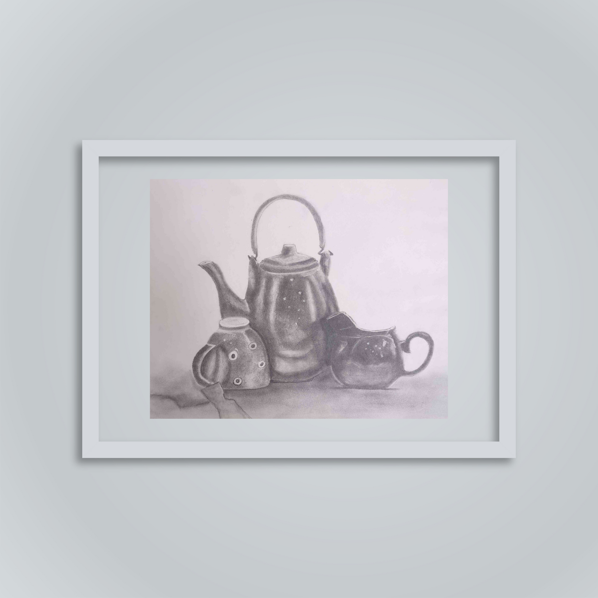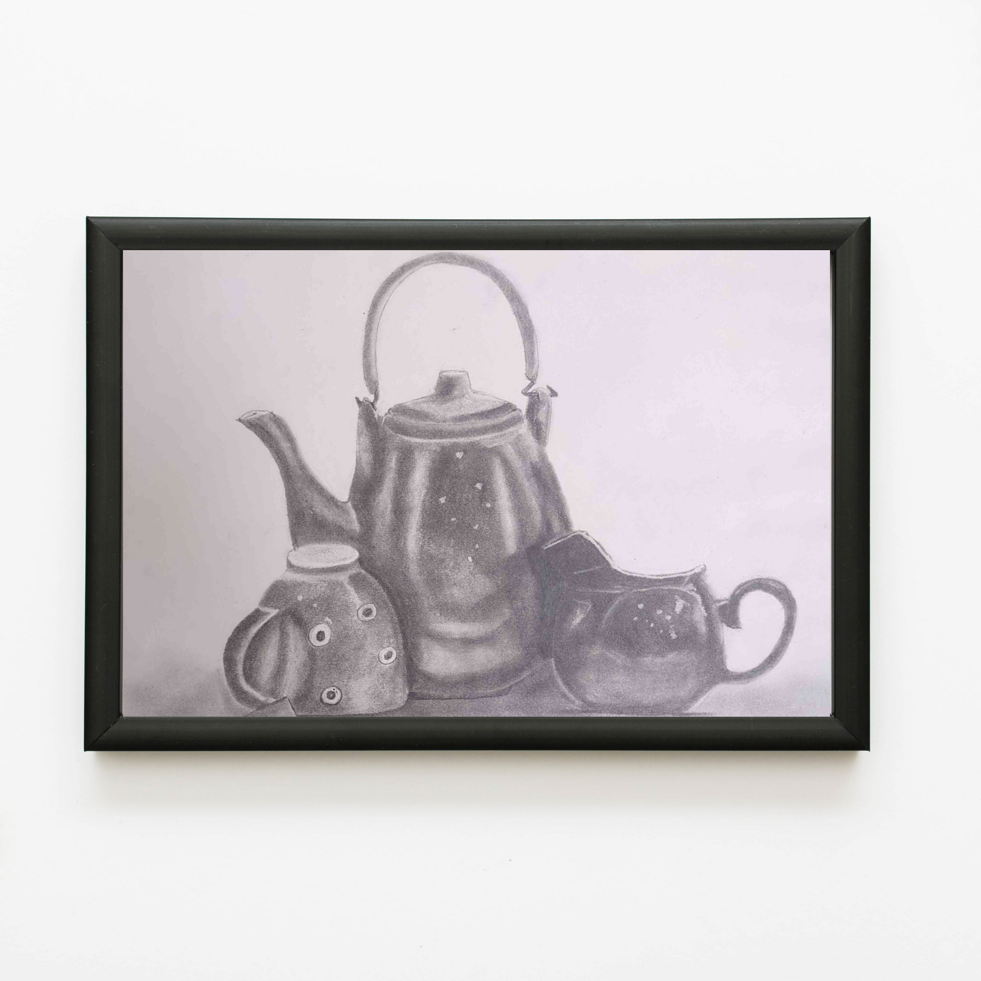 This pencil study captures a kettle and two mugs, with subtle shading that emphasizes the interplay of light and shadow. One side of the background is softly darkened, while the other is left nearly untouched, highlighting the objects’ form and presence. Minimalist and contemplative, the piece explores calmness, balance, and the quiet poetry of everyday moments.