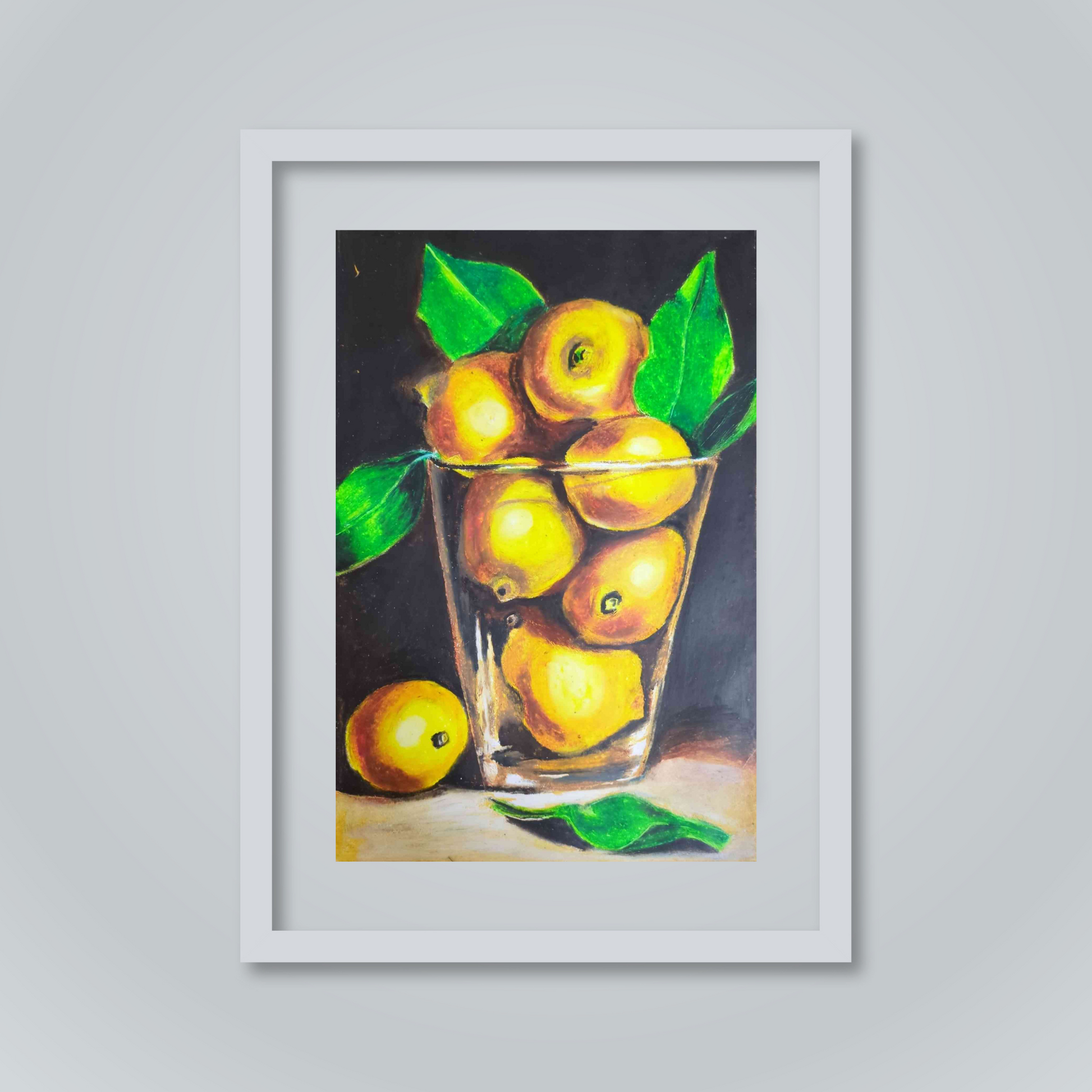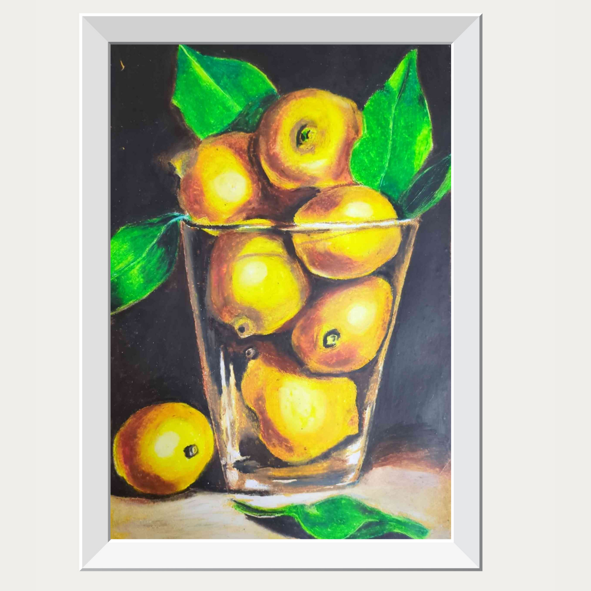 This piece is created for art lovers who appreciate minimalism with a bold edge. The vibrant lemons, held in the clarity of glass, emerge sharply against the black backdrop, turning everyday simplicity into striking elegance. Perfect for living spaces or galleries, it blends freshness with modern sophistication.